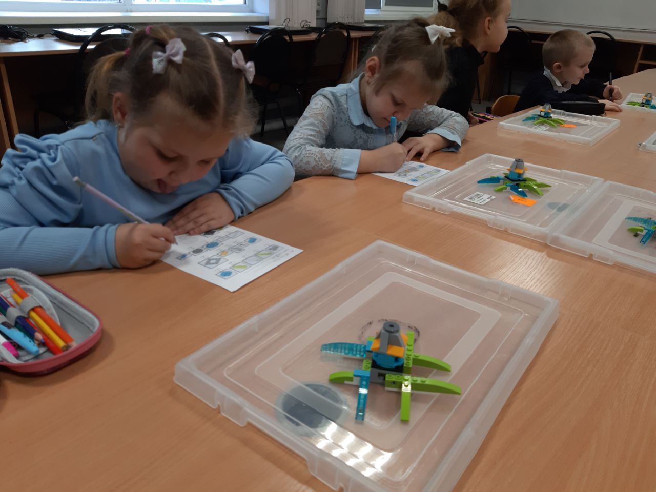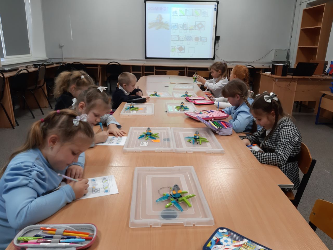 Занятие началось с повторения в игровой форме ранее изученных деталей: кирпичиков, балок, пластин. Затем ребятам было предложено по инструкции собрать модель осьминога, у которой вращалась голова и были подвижные ножки. В конце урока заполнили паспорт модели, в котором не хватало одной детали. Но ребята быстро нашли недостающую картинку и нарисовали ее.